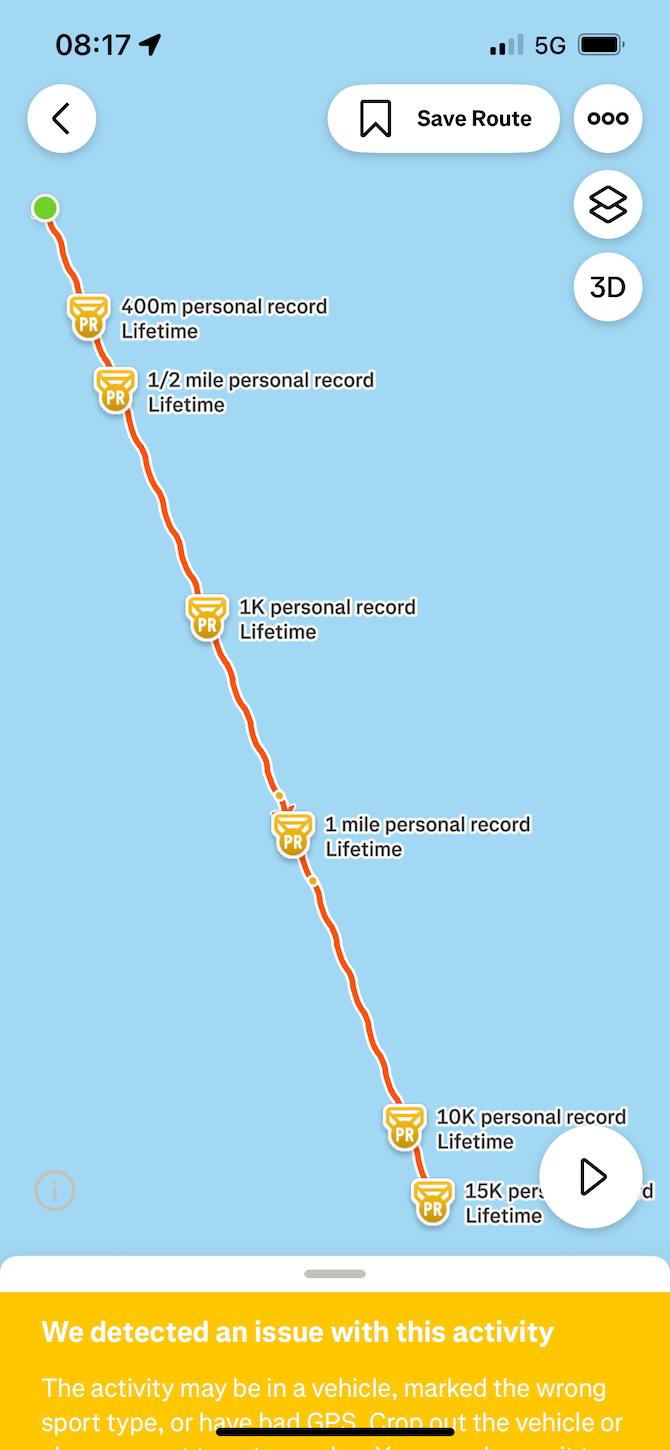 The resulting stats are entertainingly ridiculous. I love that Strava was suspicious of my ability to run sub-3 minute miles.