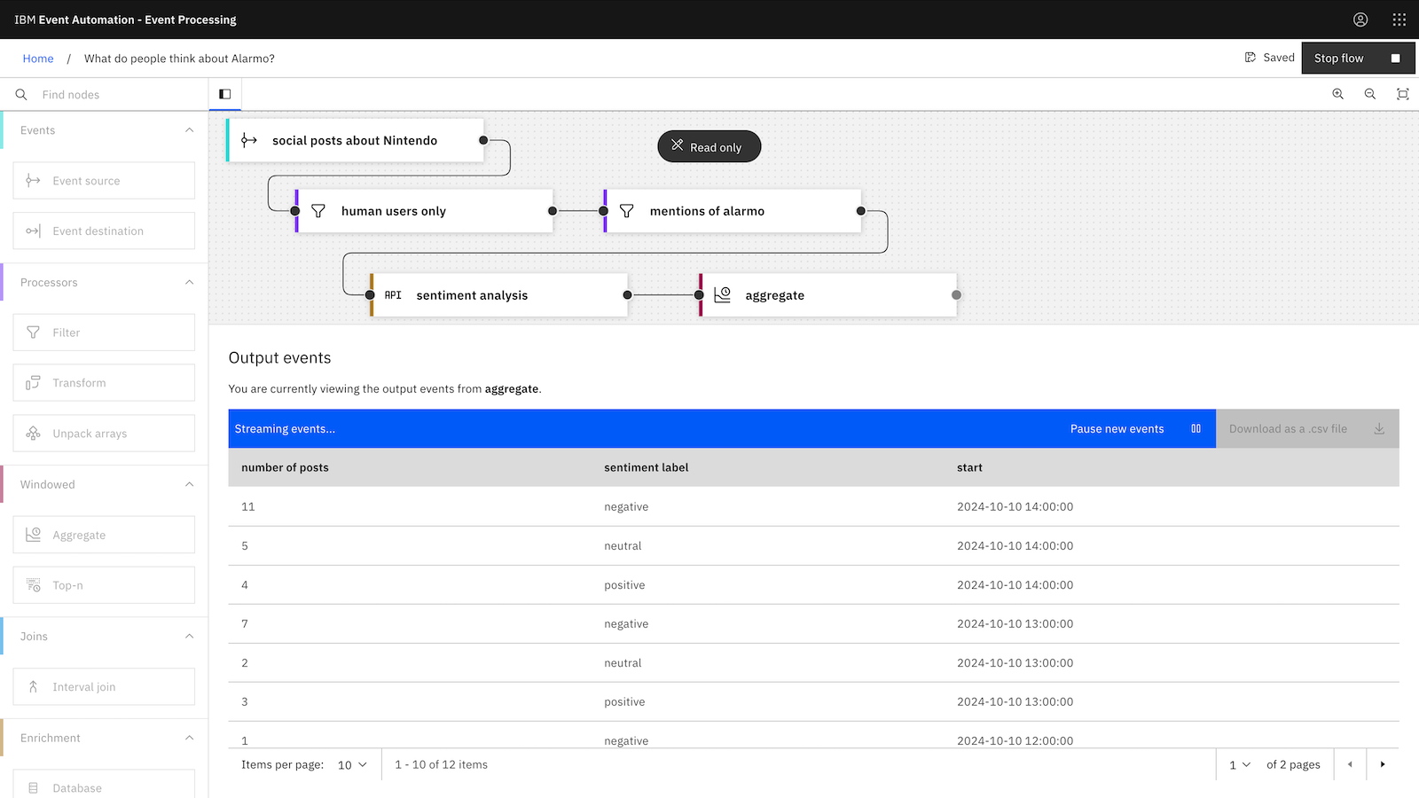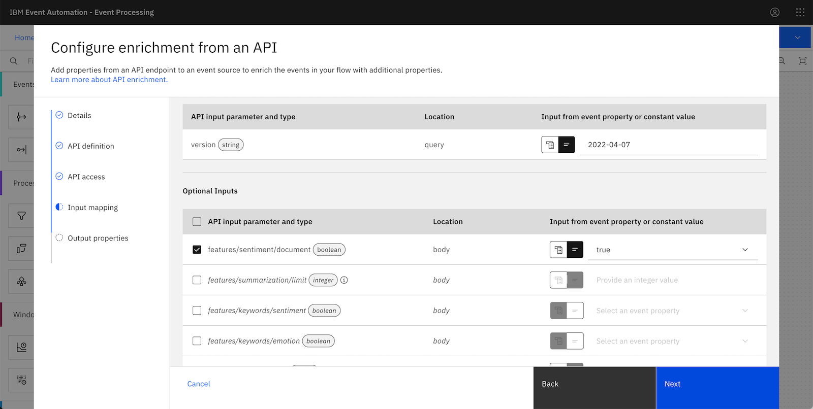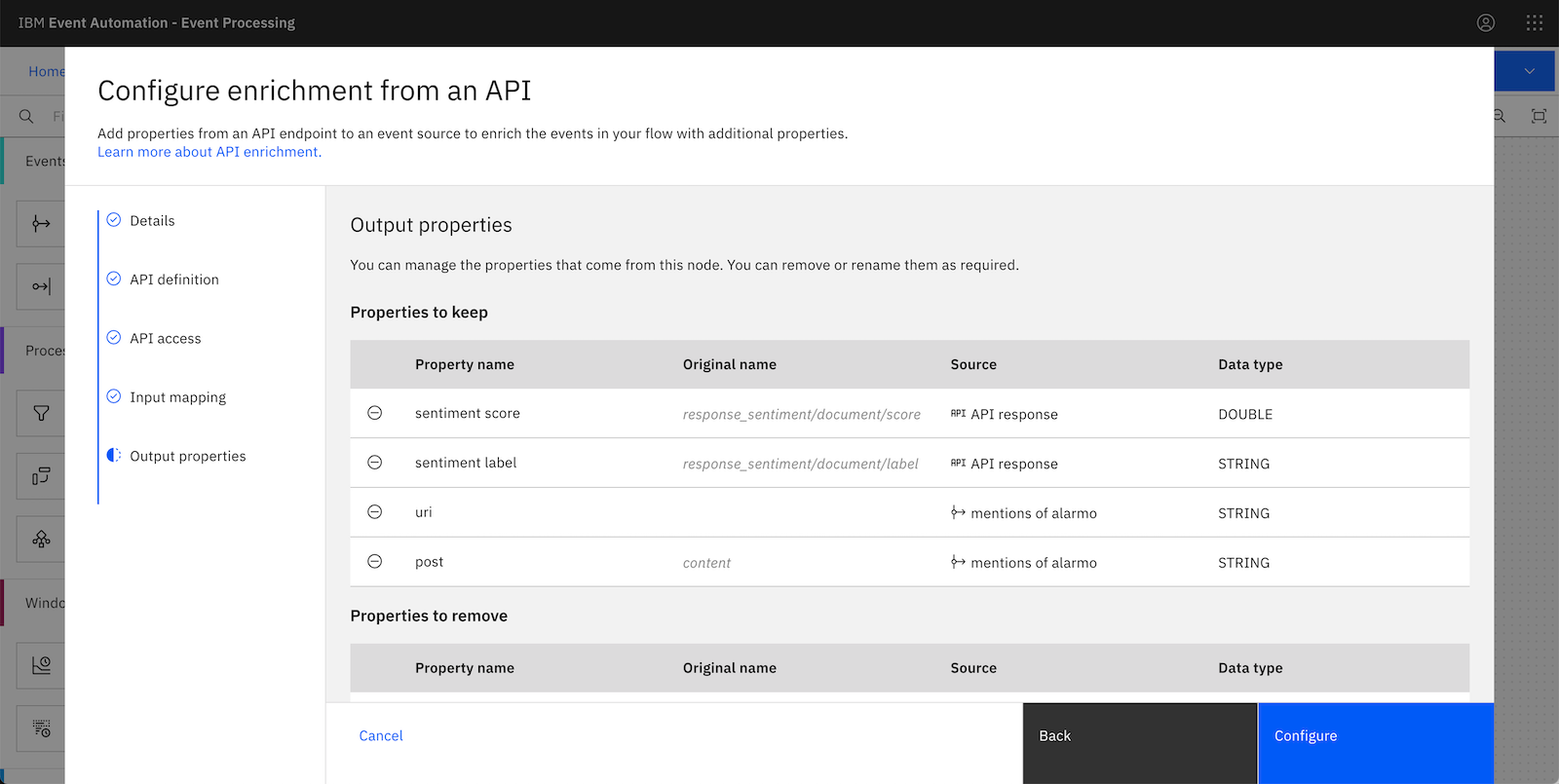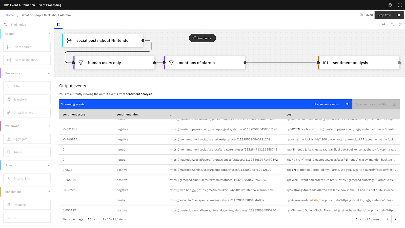 I could then use this API in Event Processing to enrich each event with the Watson NLU service’s assessment of the sentiment: