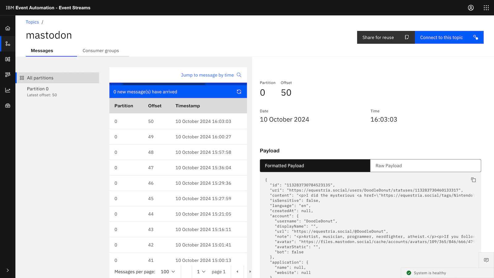 That gave me with a Kafka topic with Mastodon social media posts about Nintendo.