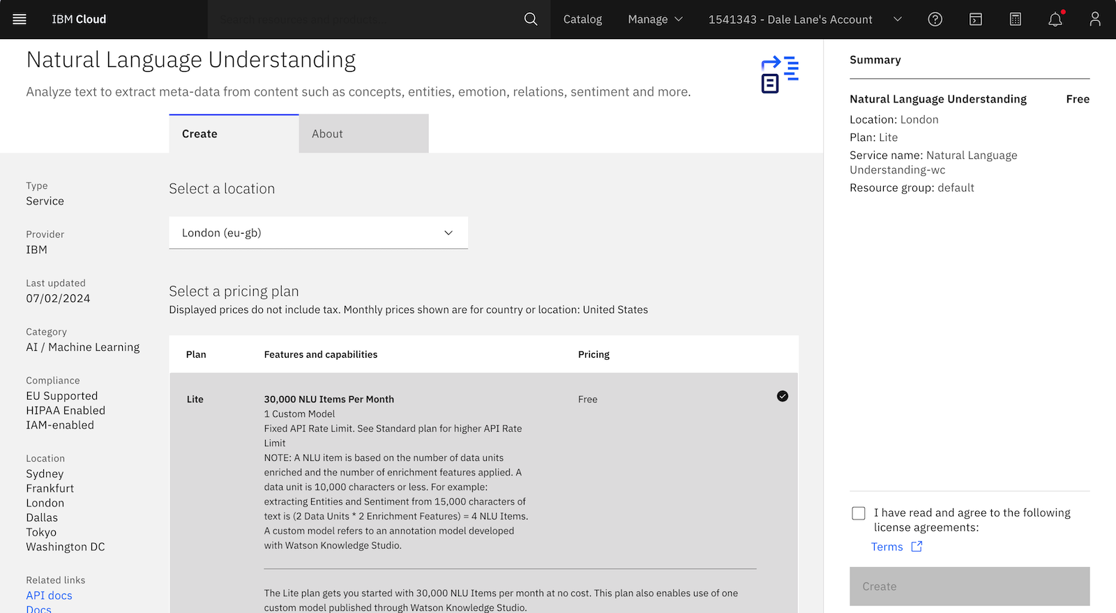 I created an instance of the service using the Lite plan as that let me get started for free.