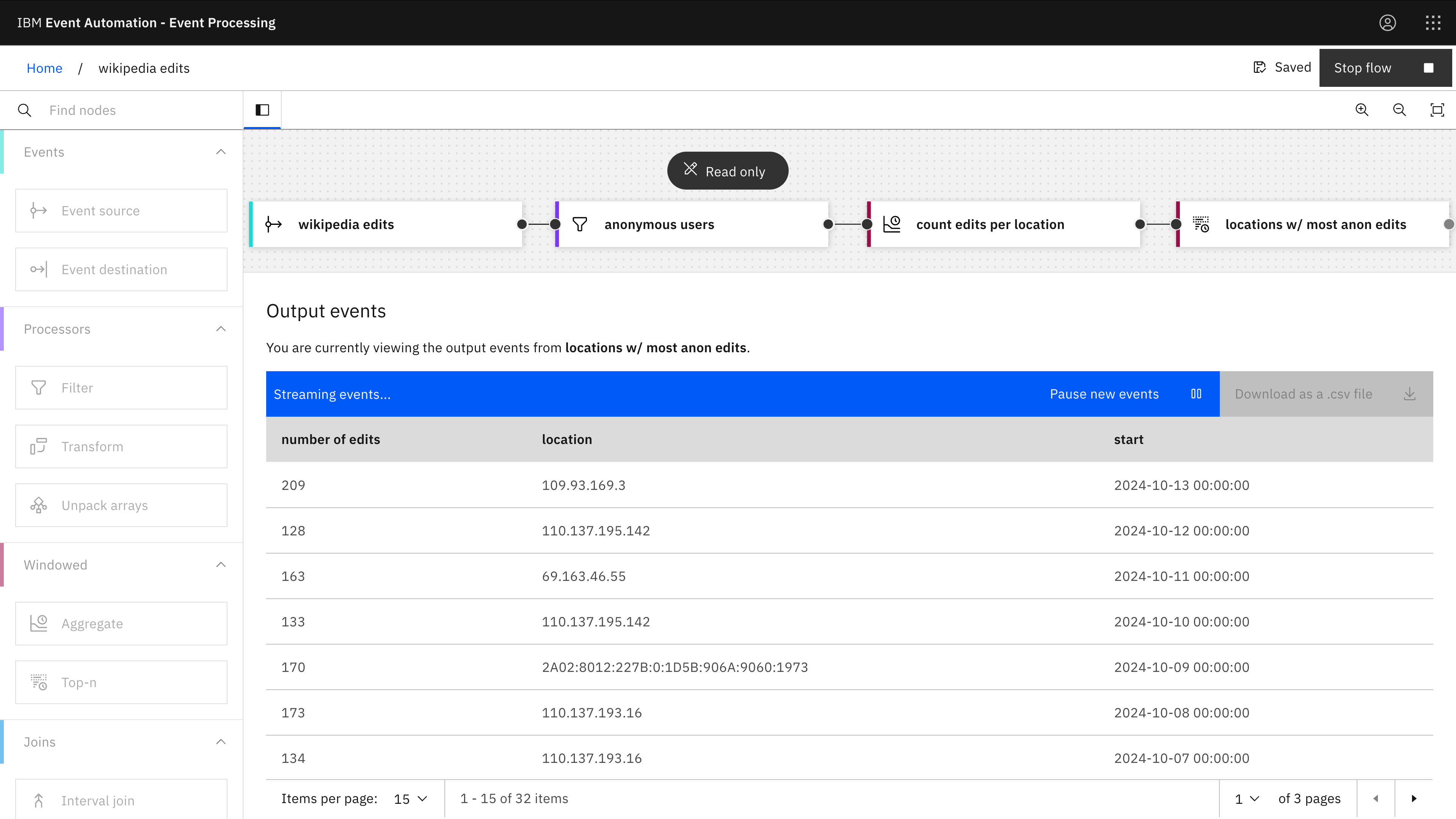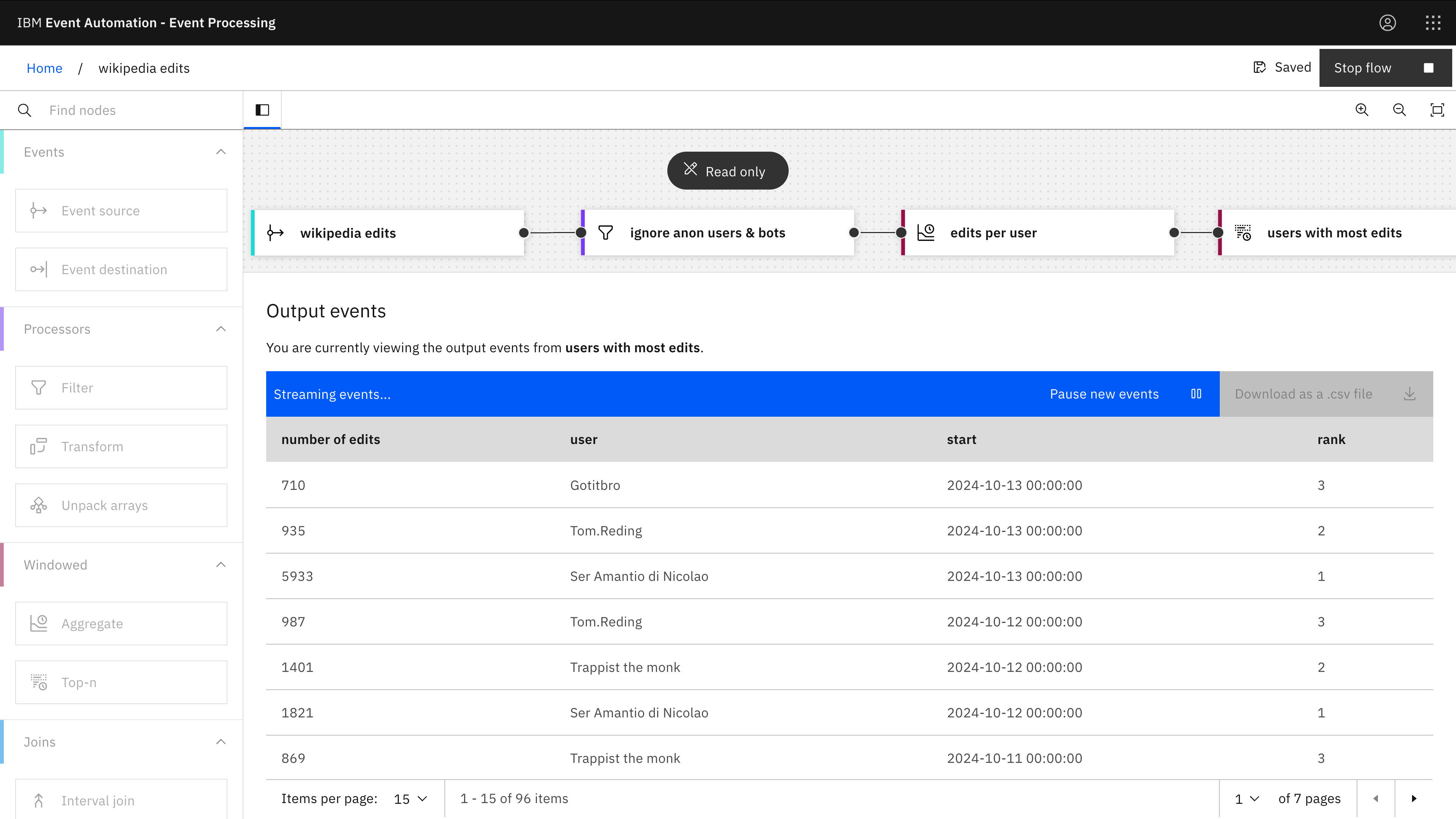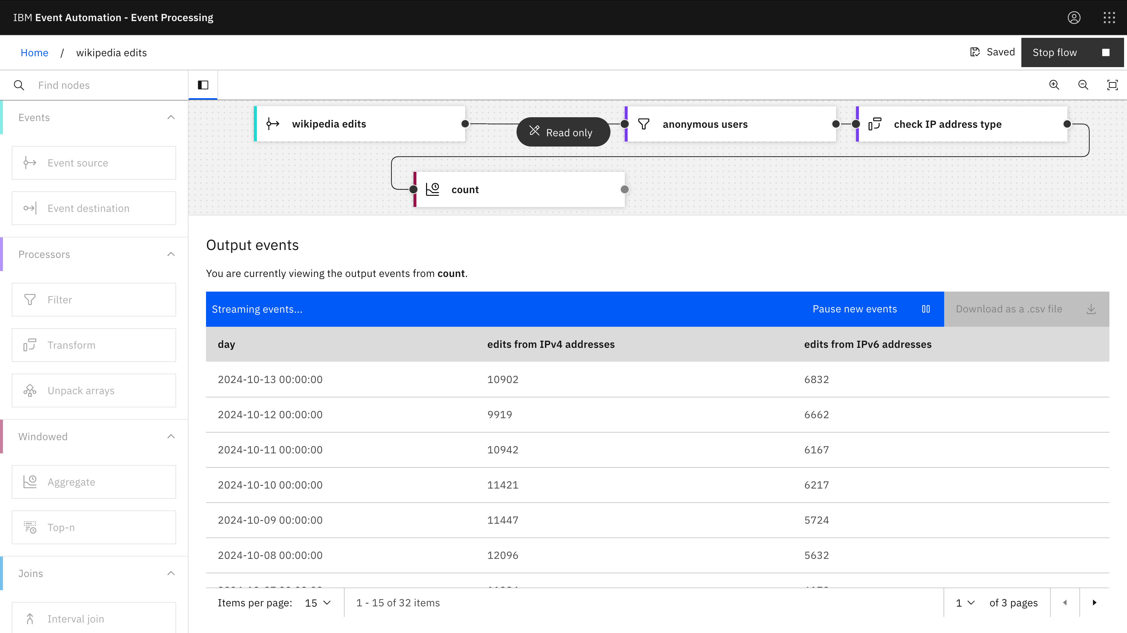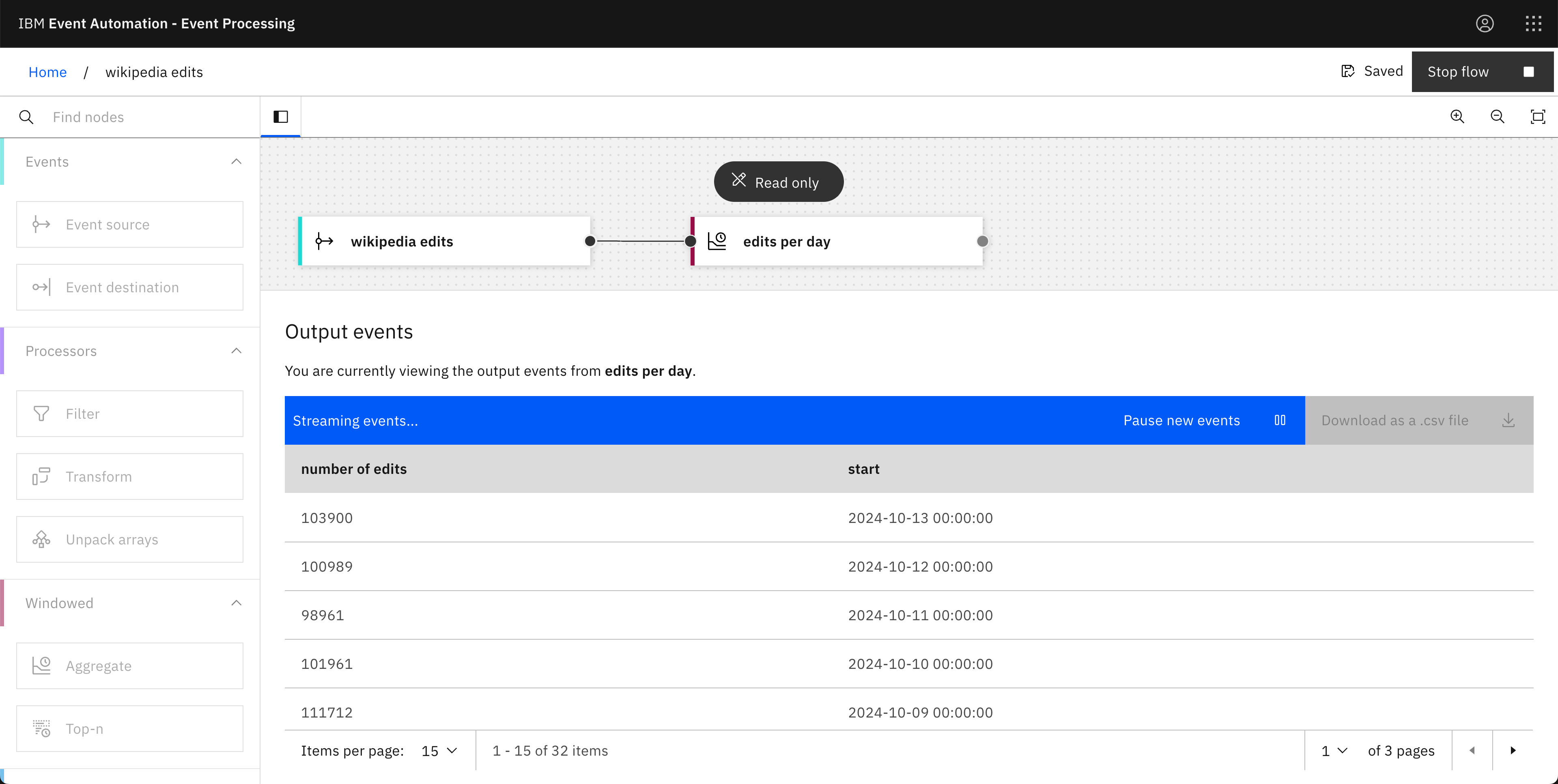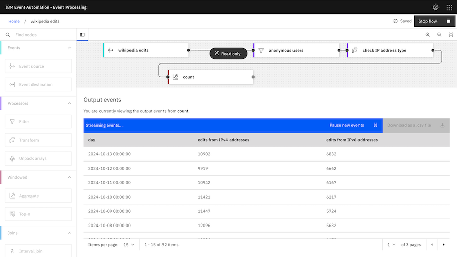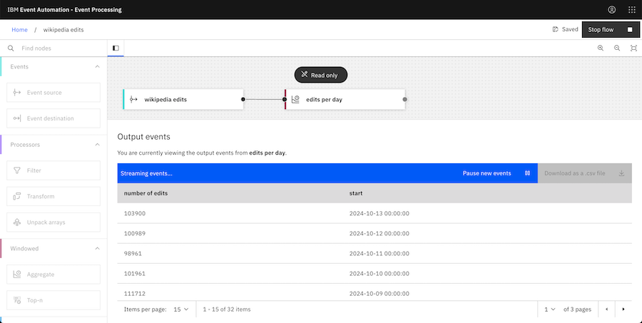 The Aggregate node lets us easily count how many edits we can see in the event stream.