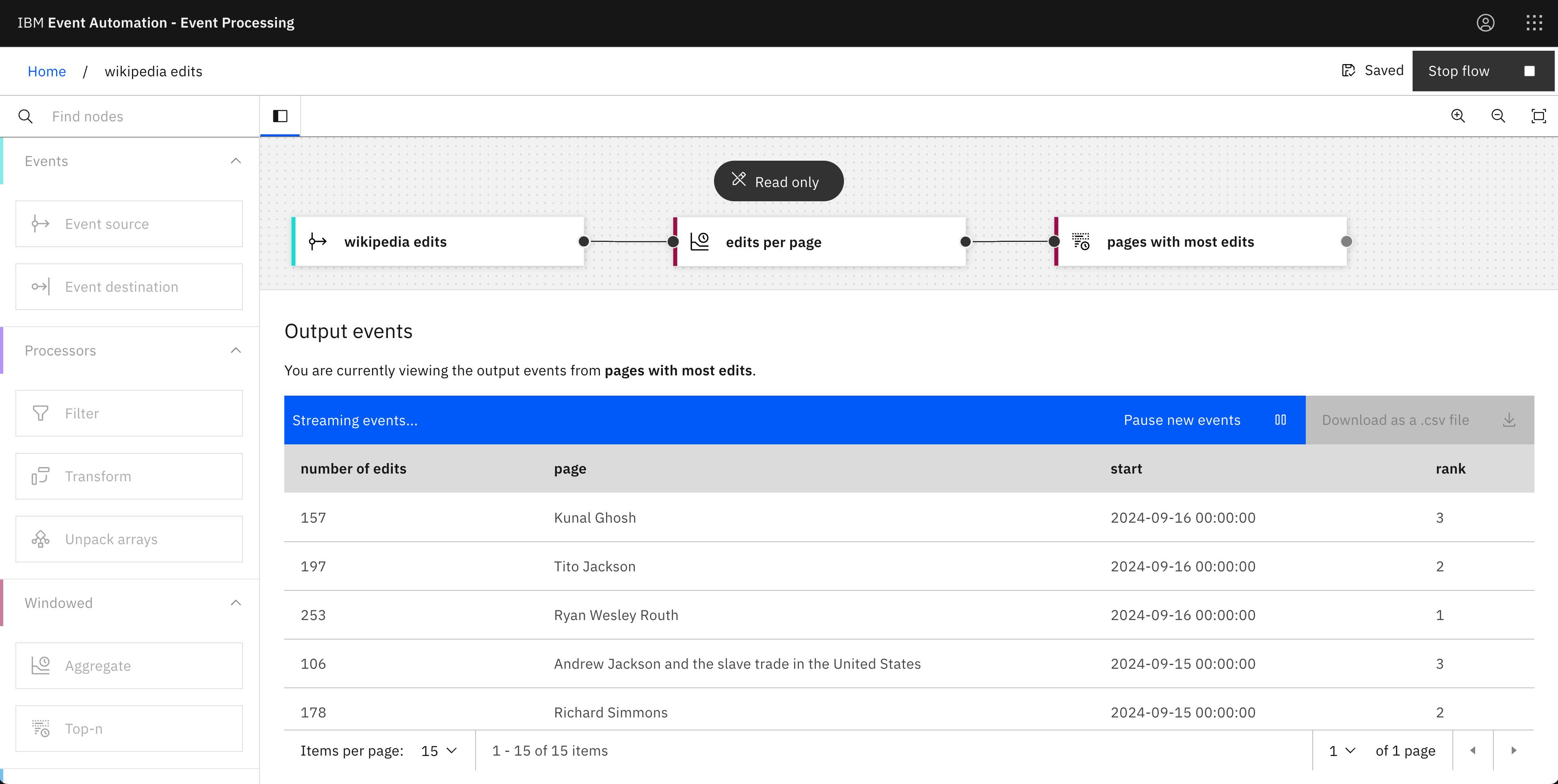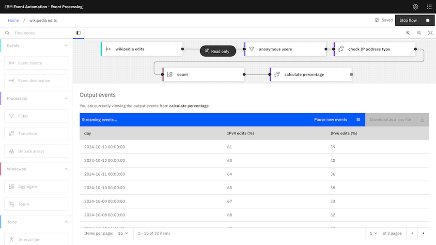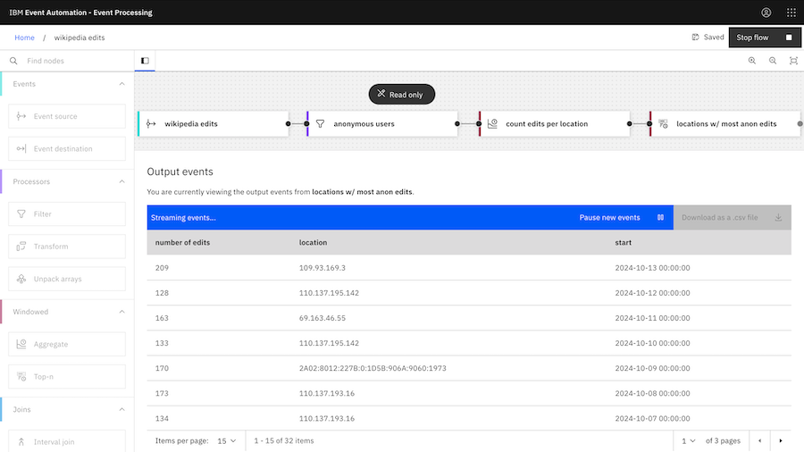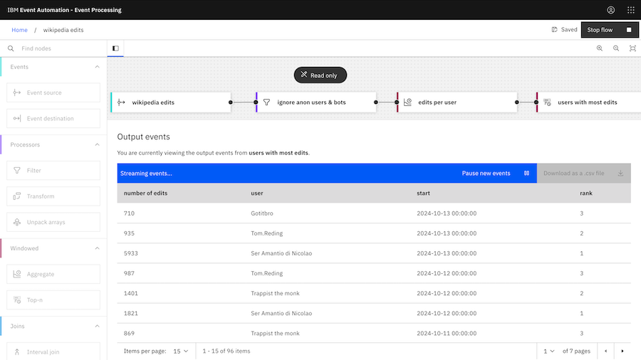 With this in mind, today I tried explaining a few of the Event Processing nodes by using them with a live stream of events representing pages that are being created and edited in the English Wikipedia.