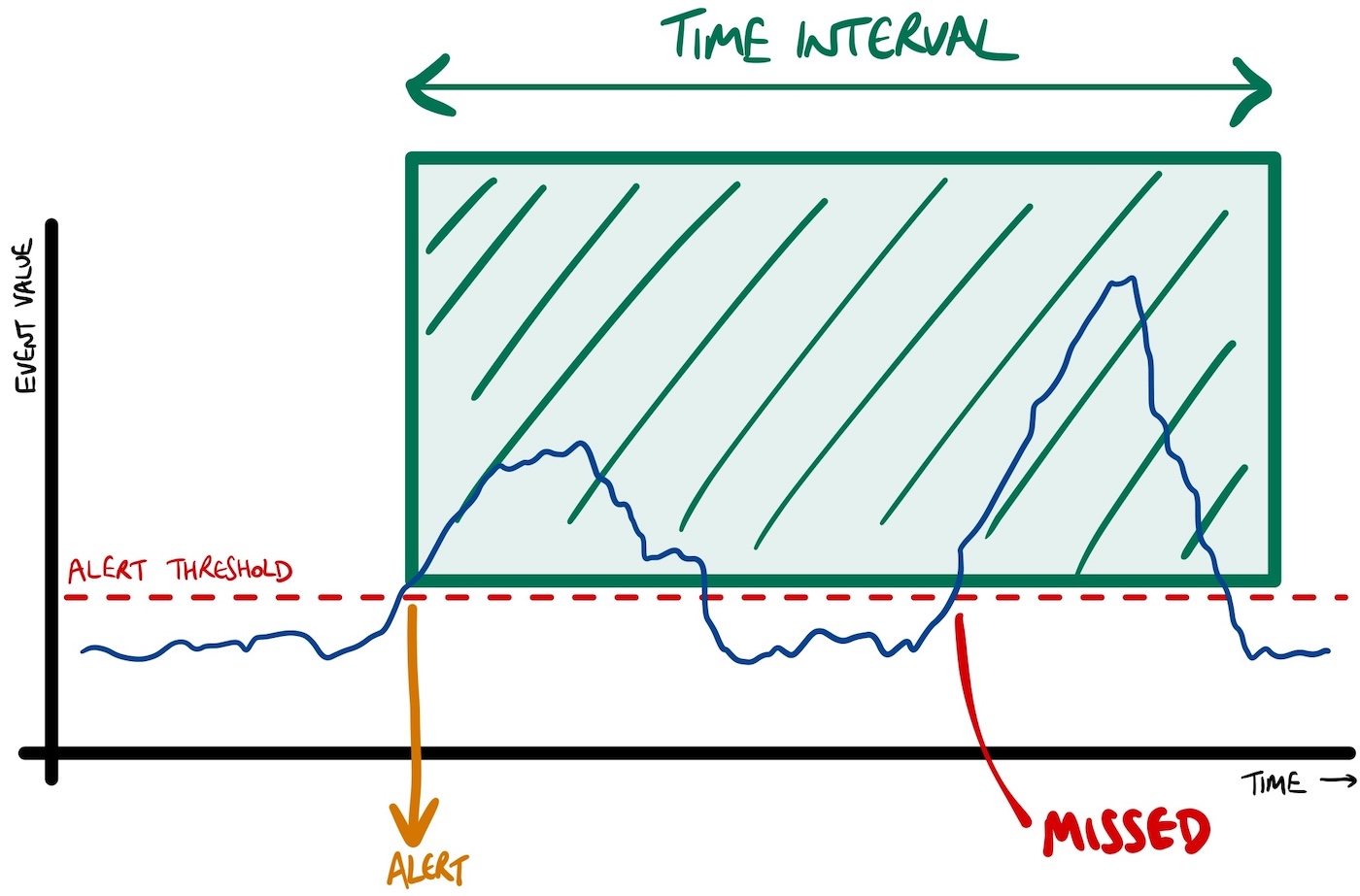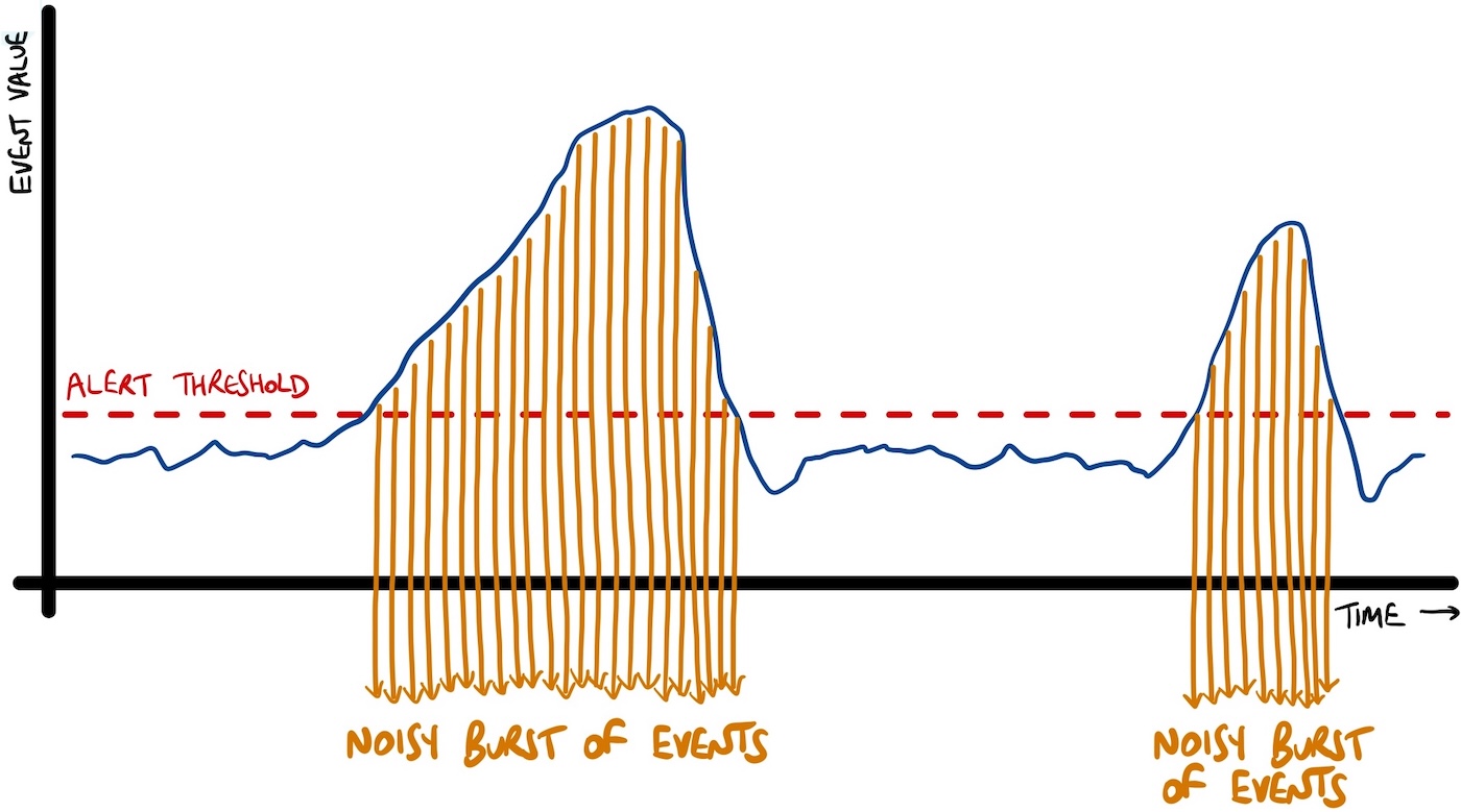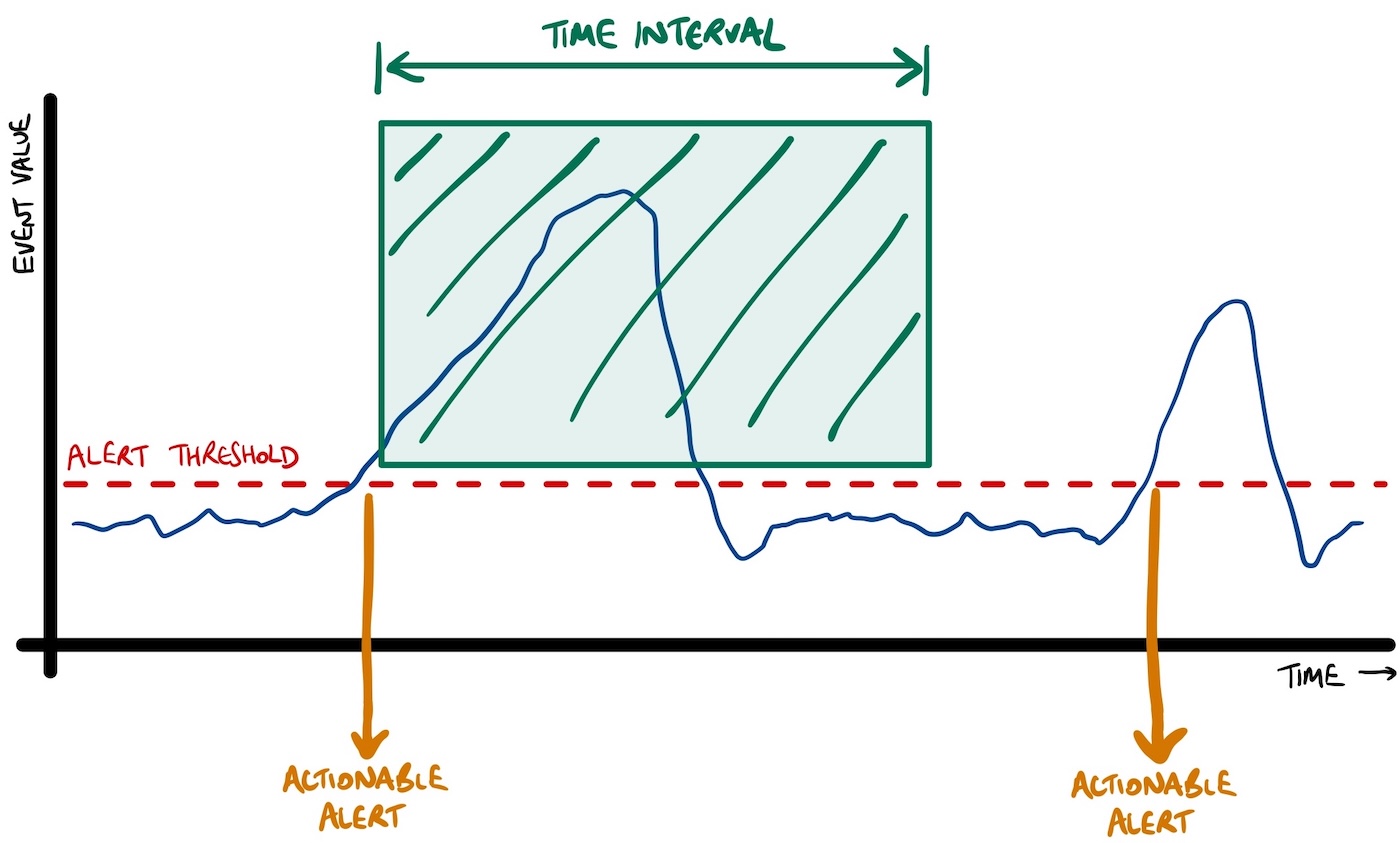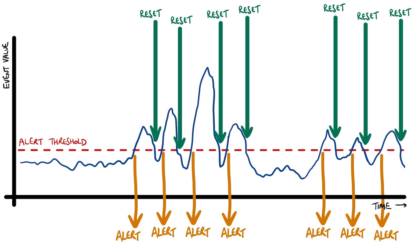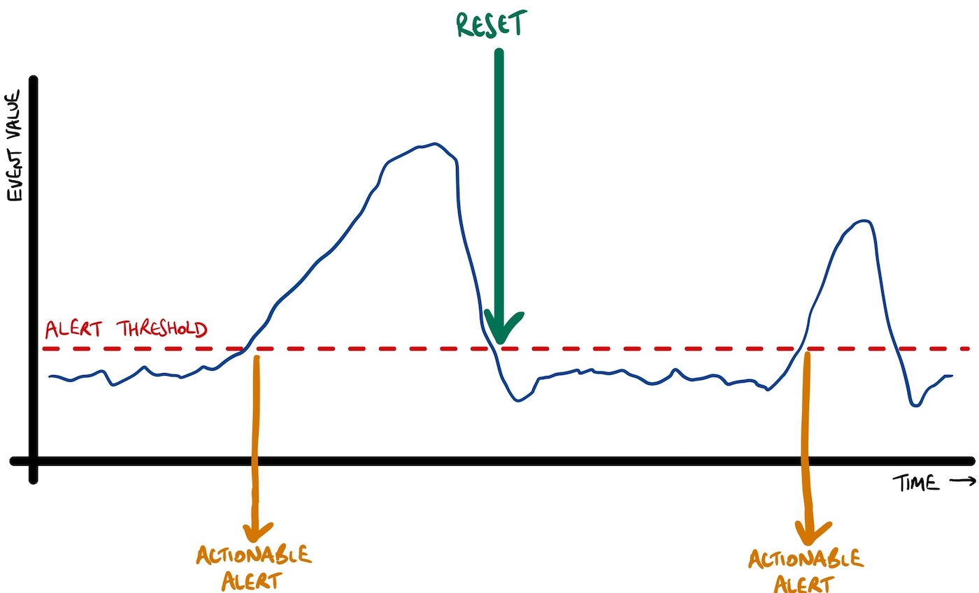 For example, is it reasonable to assume that if the value drops below the threshold, this means that the issue has been resolved? If the values in your stream of events are very spiky during a period that needs attention then the threshold approach may be less effective.