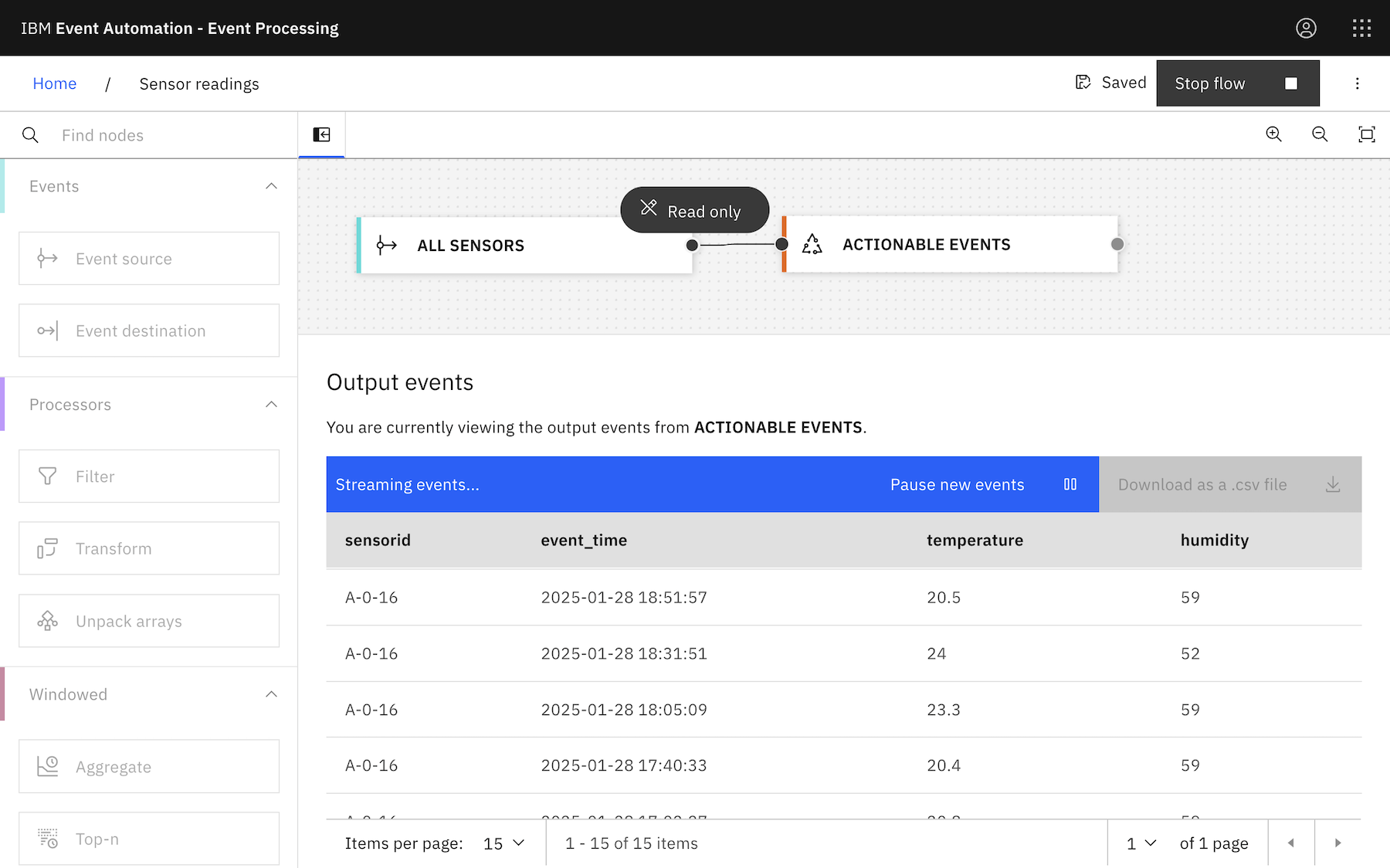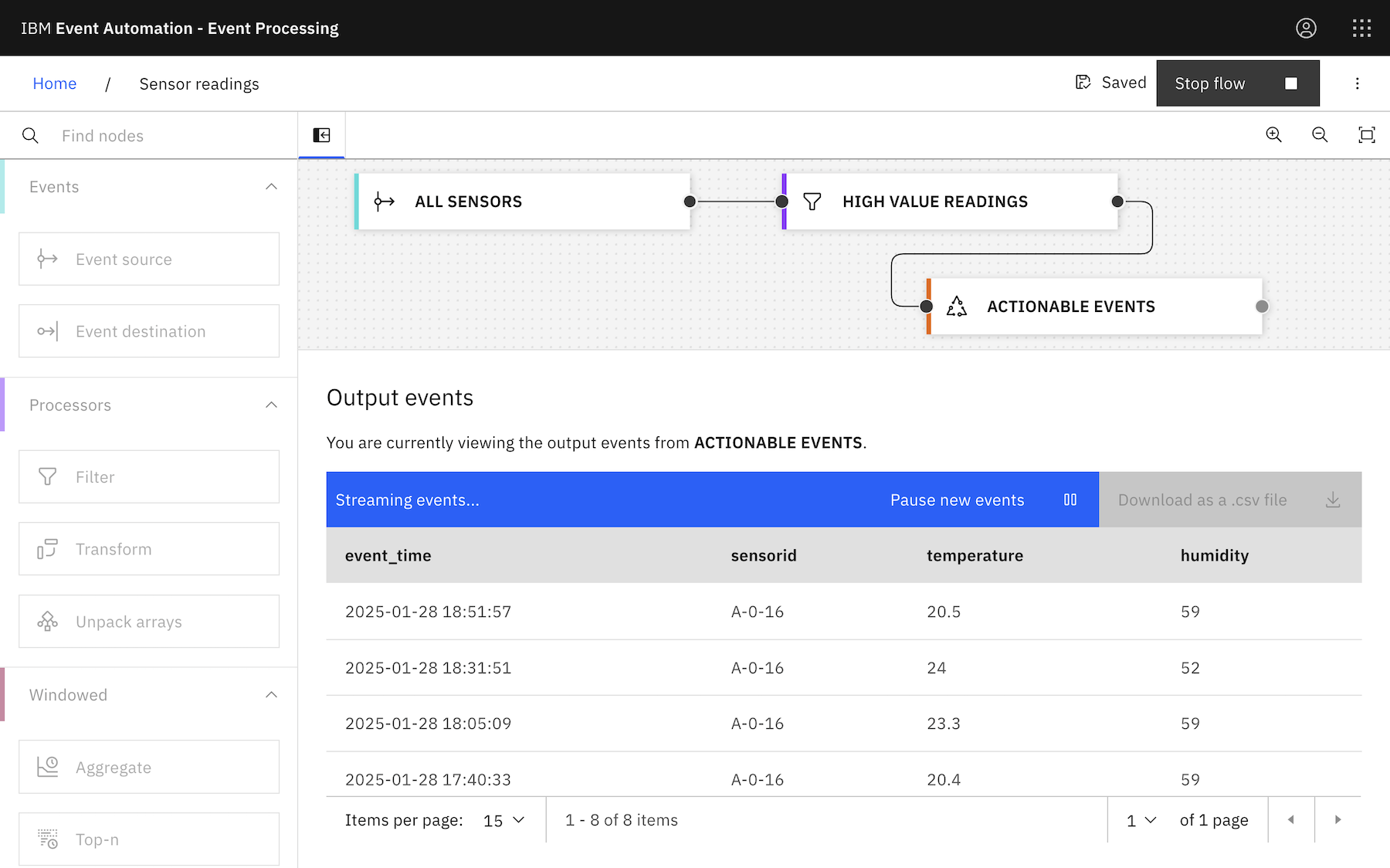 To make this less abstract, we can use the events from the sensor readings topic that the “Loosehanger” data generator produces to. Those events are a stream of temperature and humidity readings.