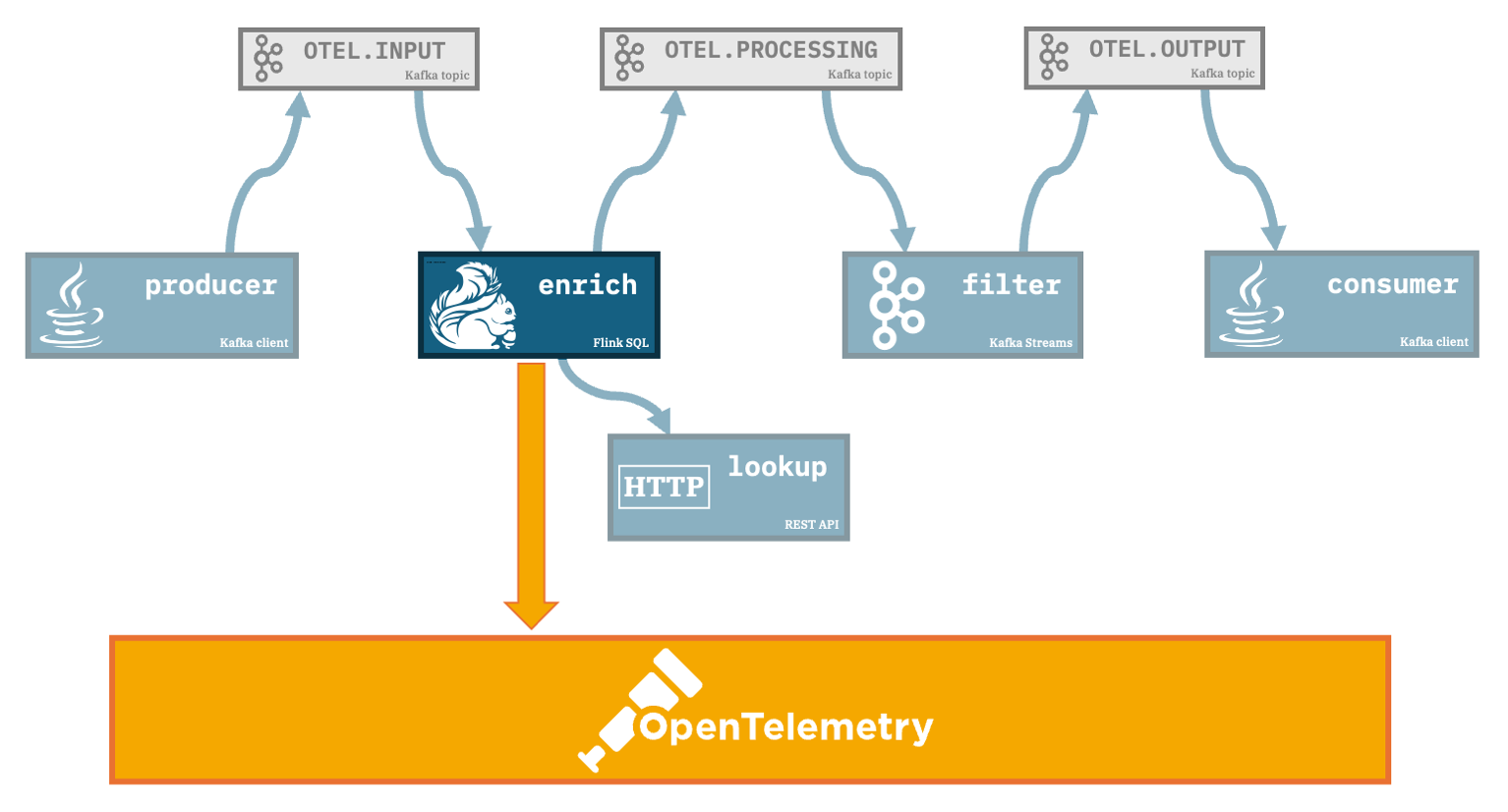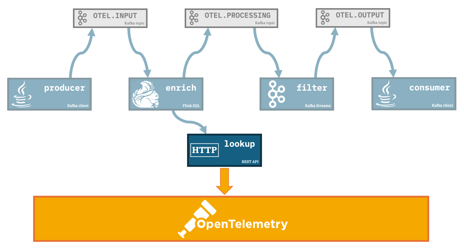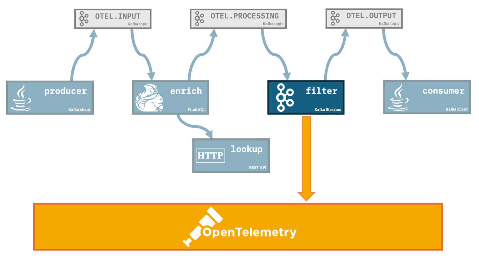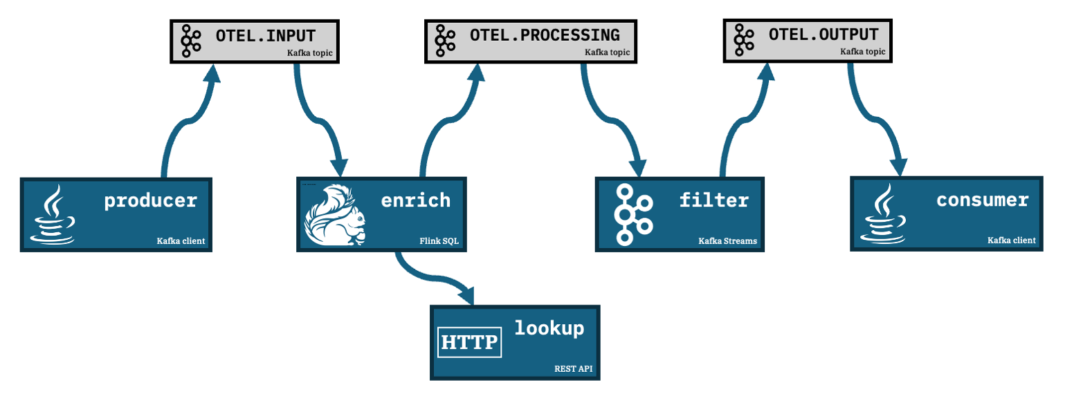 A Flink SQL job consumes the events fromOTEL.INPUT, enriches each event with additional data it retrieves from a REST API, and produces the output to a Kafka topic calledOTEL.PROCESSINGfilter