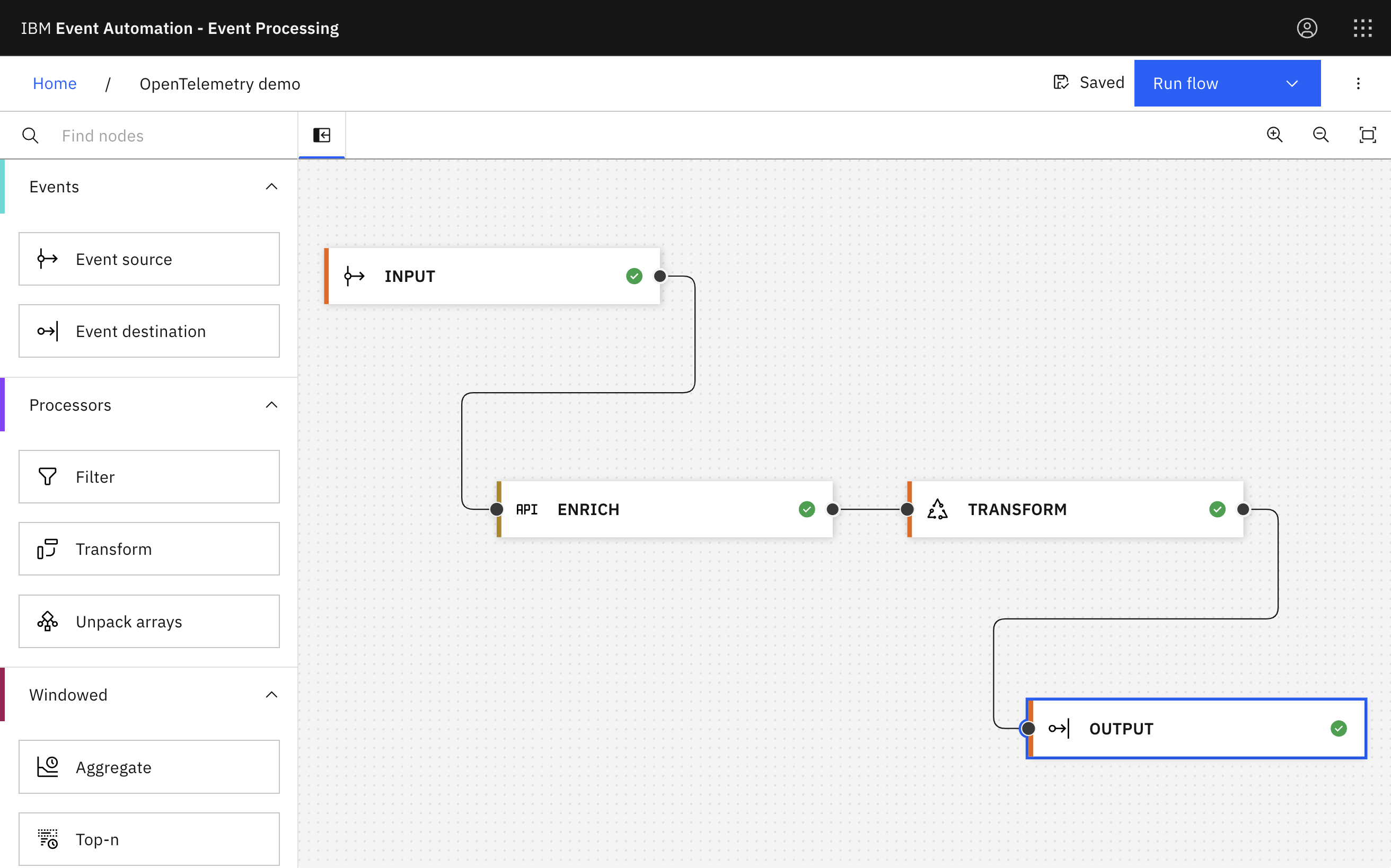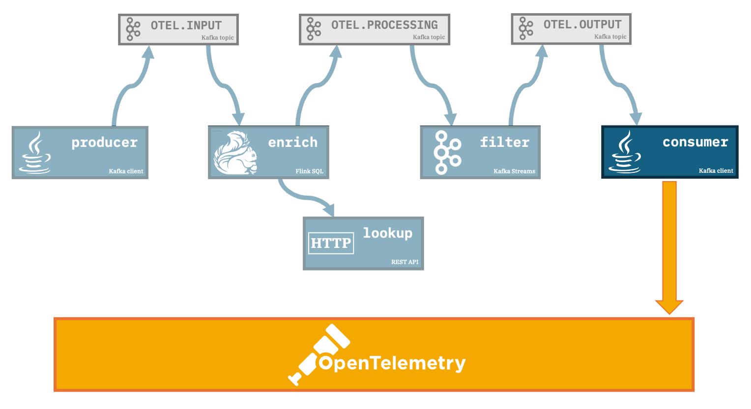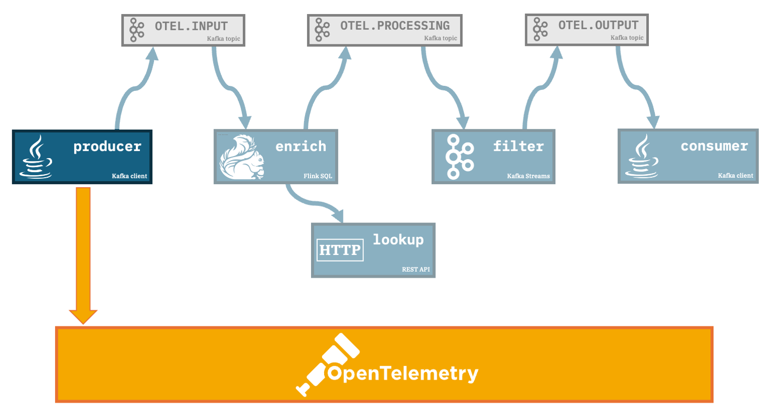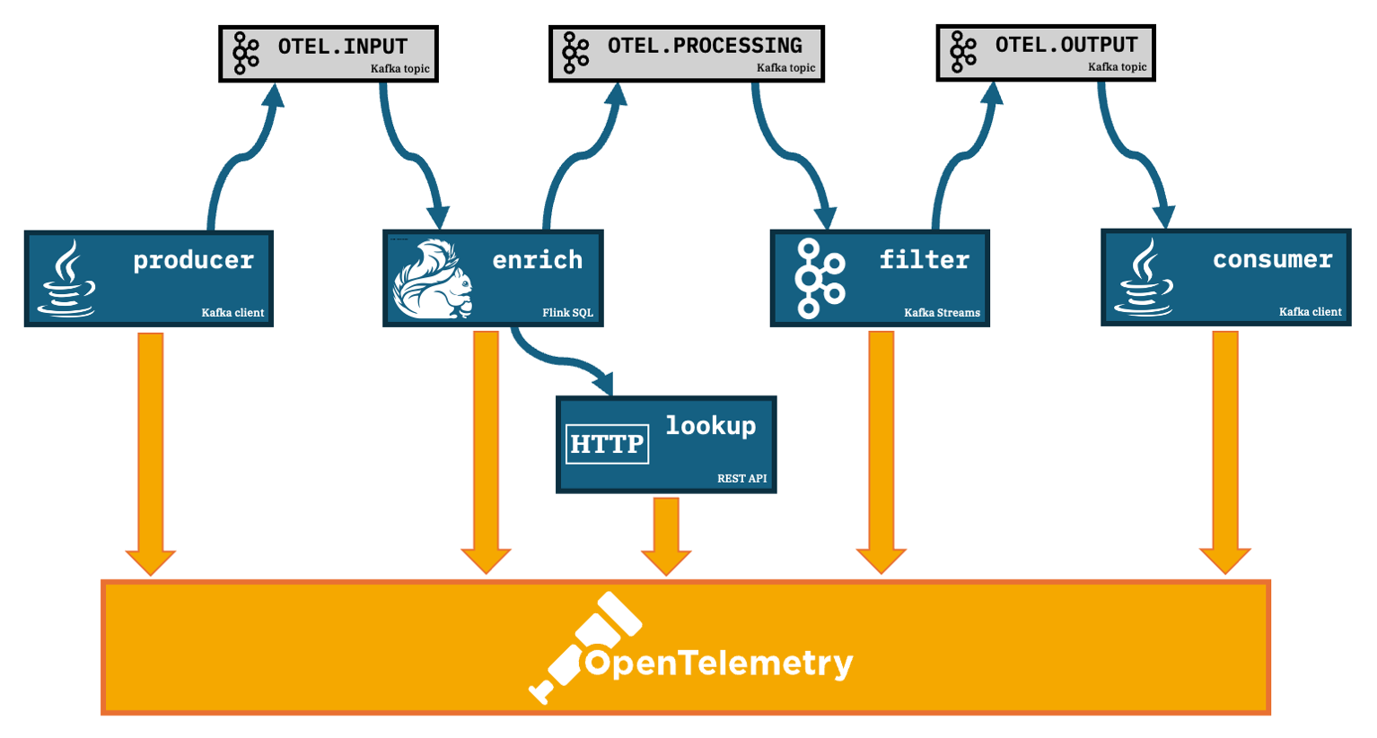 A Flink SQL job consumes the events fromOTEL.INPUT, enriches each event with additional data it retrieves from a REST API, and produces the output to a Kafka topic calledOTEL.PROCESSINGfilter