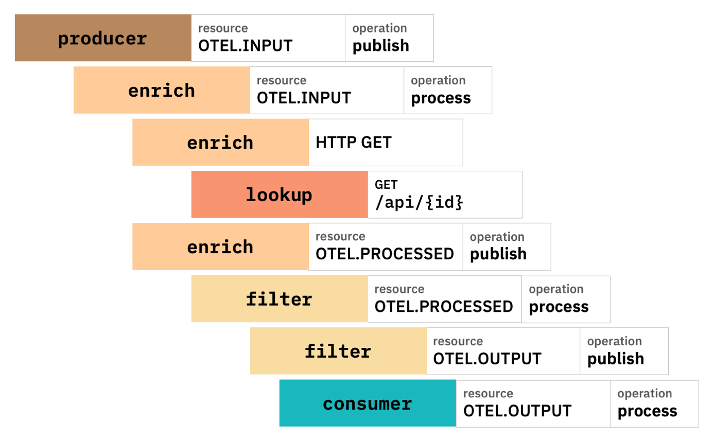 The observability offered by the spans collected by OpenTelemetry shows you what is functionally happening in your infrastructure, even if the processing of events is asynchronous and distributed across multiple applications, servers, and systems – which is typical when working with Kafka events.