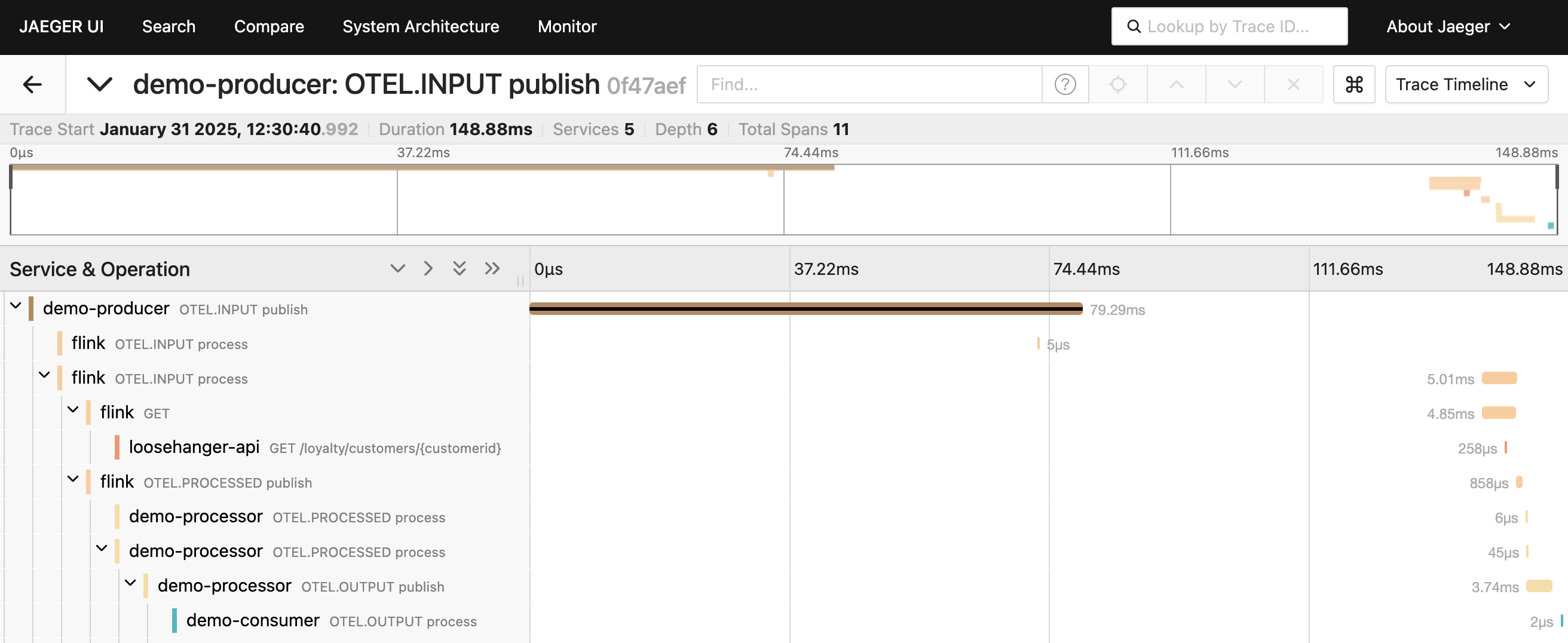 In the Jaeger UI, traces for this demo looked like this: