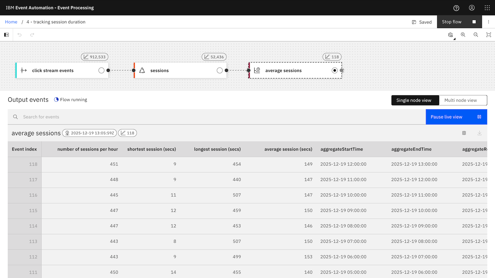 Many of the examples I wrote using only built-in SQL used the “sessionid” property in each click event. The sessionid let me group together click events caused by the same user as part of the same session as they clicked around a retail site. My examples using the built-in session window functionality all had to wait until a session was over (i.e. until no click events were observed with the session id for a pre-determined amount of time) before they could emit an output for that session.