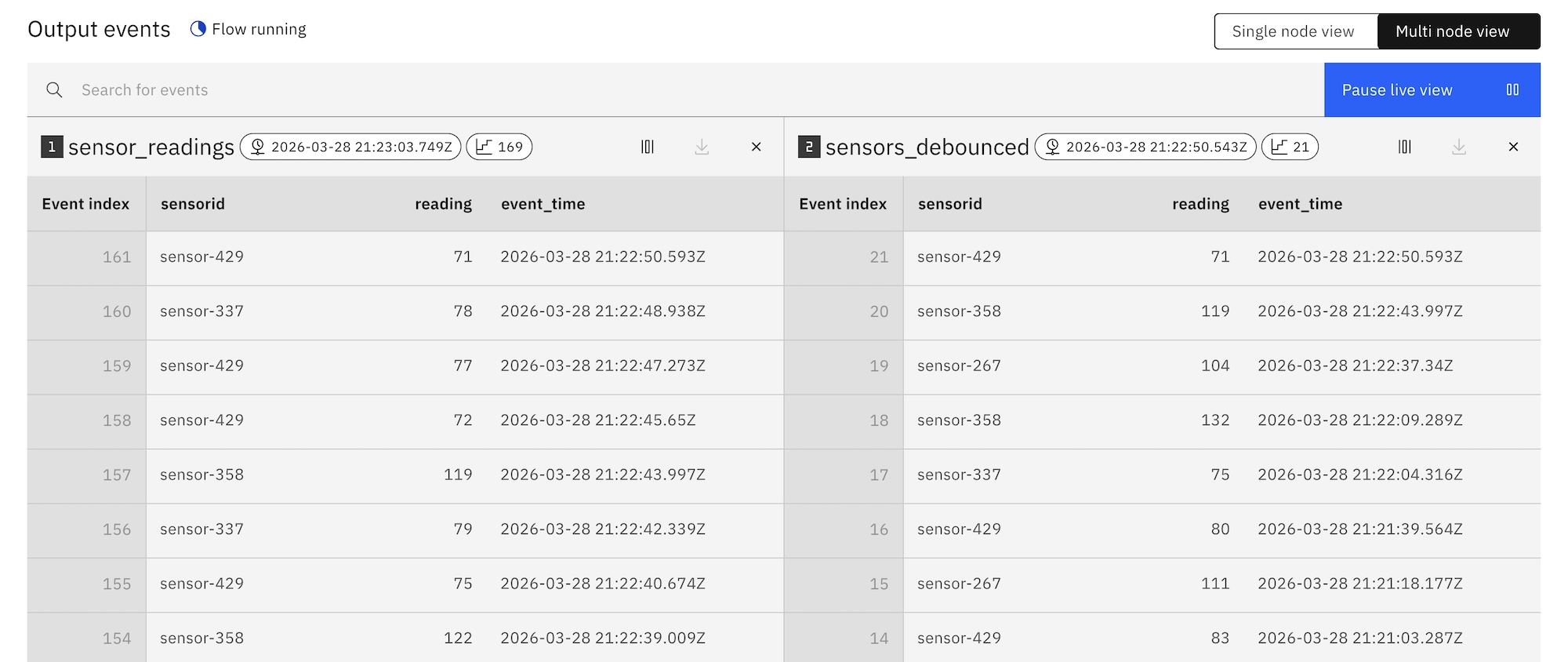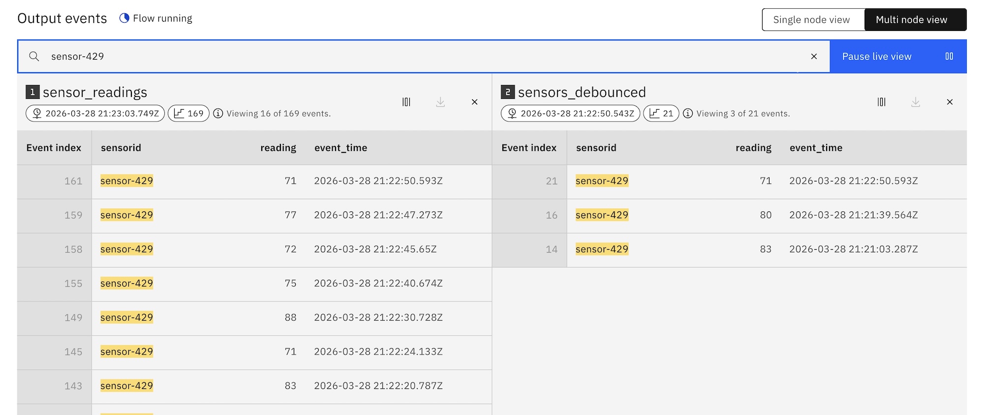 filtering “sensor-429”, all readings on the left, debounced view on the right