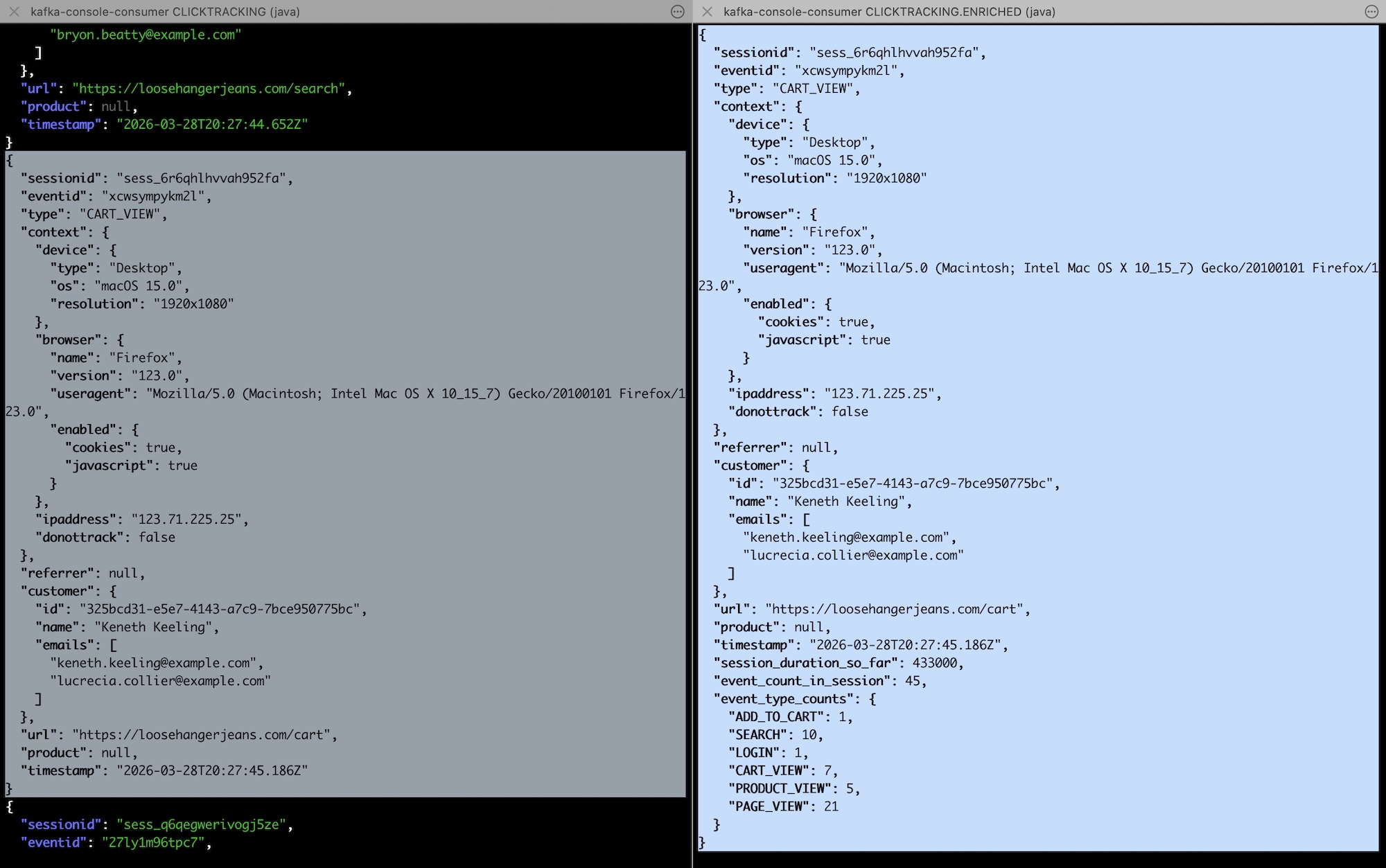 Every click event is being enriched with additional properties saying how long the session has been going so far, and how many of each type of click event has been observed from this user since the session started.