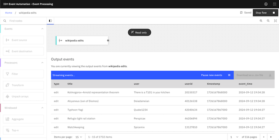 With this in mind, today I tried explaining a few of the Event Processing nodes by using them with a live stream of events representing pages that are being created and edited in the English Wikipedia.