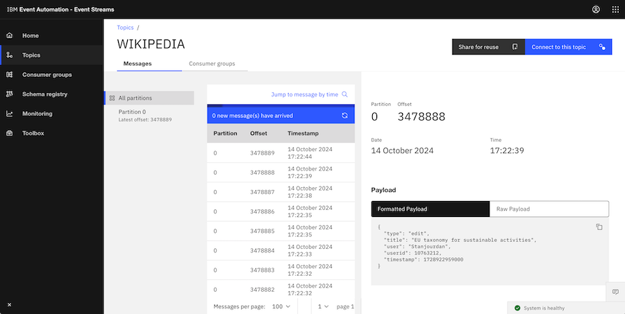 Every edit on Wikipedia results in an event on the Kafka topic, so there are typically a few events a second. It’s not a super-high-throughput topic in Kafka terms, but there are enough events to try out interesting ideas.